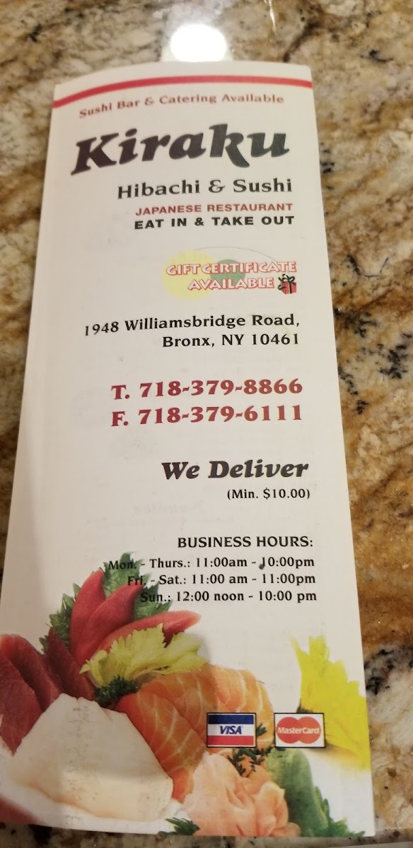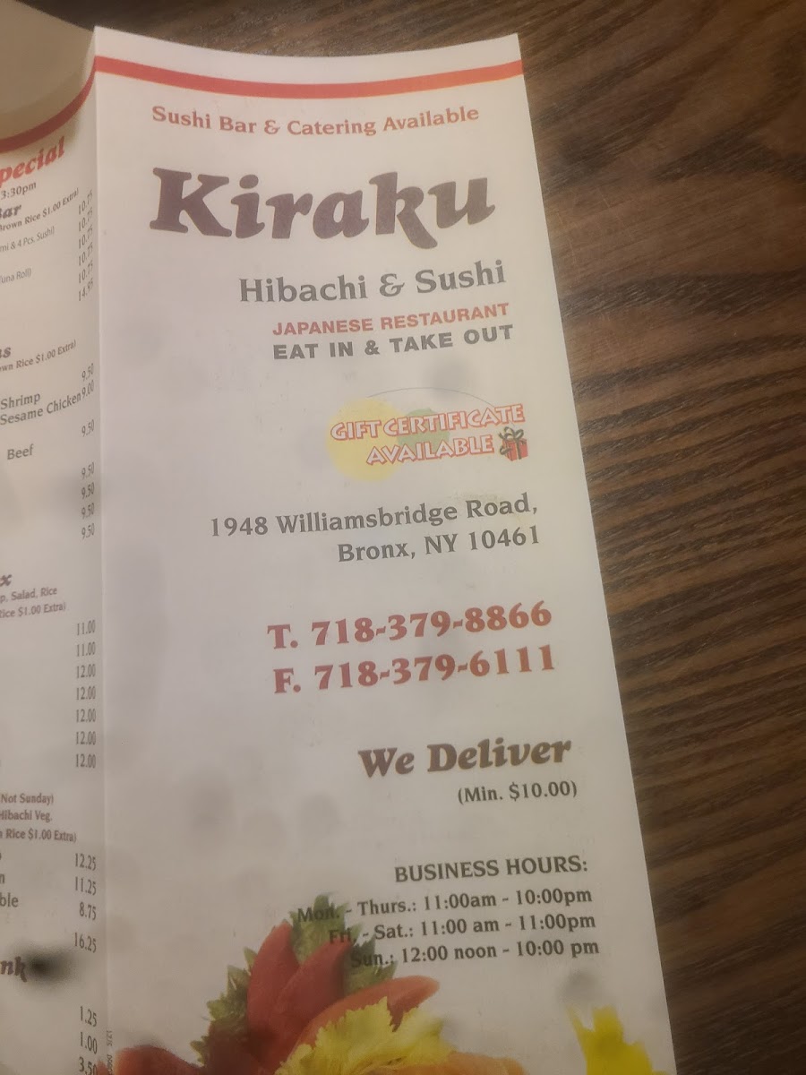 For lunch, the Teriyaki specials and curry options deliver great value without sacrificing taste, making it ideal for a quick yet fulfilling bite. Customer favorites include the spicy tuna roll and sushi assortments, praised for their freshness and simplicity. With prompt service and a cozy atmosphere, Kiraku’s menu invites sushi lovers and Japanese cuisine enthusiasts alike to enjoy a vibrant, accessible taste of Japan in the Bronx.